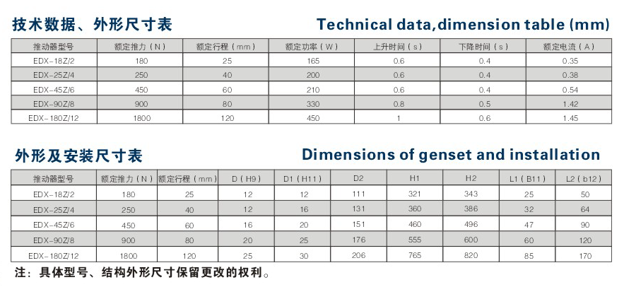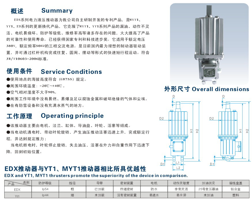 EDX系列電力電壓推動(dòng)器為我公司自主研制開發(fā)的專利產(chǎn)品,是MYT1、YT1、ED系列的更新?lián)Q代產(chǎn)品,他克服了MYT1、YT1系列產(chǎn)品的漏油,動(dòng)作不靈活、電機(jī)易燒壞,防護(hù)等級(jí)低、維修率高等諸多存在的問題,大大提高了產(chǎn)品的可靠性和使用壽命。已經(jīng)獲得國(guó)家專利和科技進(jìn)步獎(jiǎng)。它適用于額定電壓380V,額定頻率50HZ的三相交流電源,是目前國(guó)內(nèi)理想的制動(dòng)器驅(qū)動(dòng)裝置,并可通過杠桿機(jī)構(gòu)完成往復(fù)、圓周、擺動(dòng)等形式的快速短行程運(yùn)動(dòng),符合JB-/T10603-2006標(biāo)準(zhǔn)。